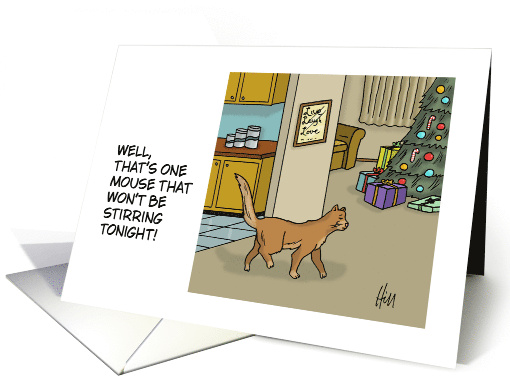 Funny Christmas card with a cartoon cat coming out of the kitchen. The words say: Well, that's one mouse that won't be stirring tonight! (Christmas Eve) Inside says: Merry Christmas