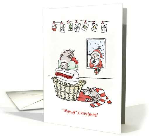 This cute Christmas card features two cats who are sleeping on freshly washed laundry on Christmas Eve. Santa Claus is at the window, ready to leave them a present.