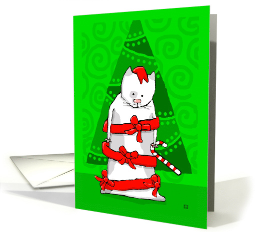 Celebrate Christmas with this cute greeting card featuring a gray and white cat standing in front of a Christmas tree, wrapped in red ribbons and bows, holding a candy cane. Original holiday design by S. Fernleaf.
