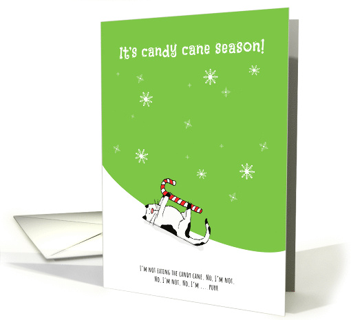 Cats love Christmas! All those empty boxes! Candy canes to lick and pretty lights to tangle, a tree to climb in and it's kitty heaven. A cat in the snow is holding a candy cane, or is she/he? S. Fernleaf Designs.