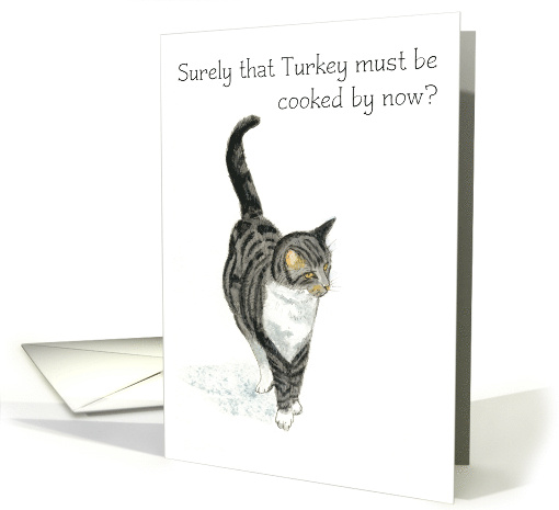 A Christmas card with a grey tabby and white cat from a hand-painted watercolour by Judy Adamson. The text on the front is, 'Surely that turkey must be cooked by now?' and the inside greeting is 'Happy Christmas!'.