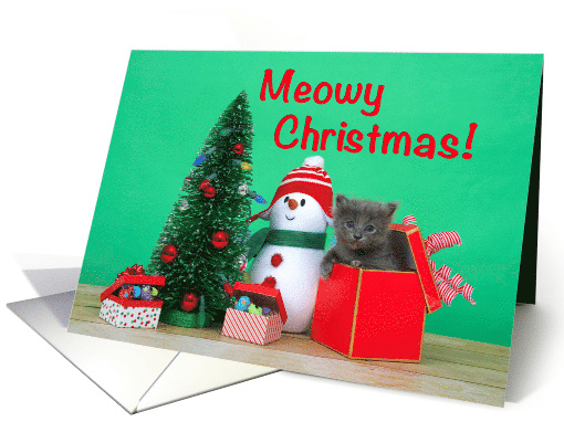 Adorable little grey kitten peaking out of a Christmas present next to a kitten sized tree with kitten life sized snowman. Festive holiday card pur-fect for the cat lovers in your life.