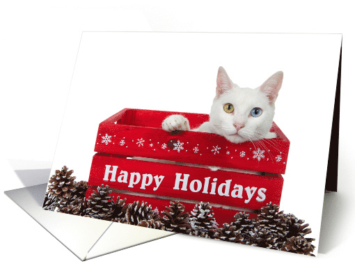 All white cat looking directly at viewer with mesmerizing eyes of different colors, laying in a red wooden box with Happy Holidays greeting. Purr-fect holiday greeting for your cat loving friends and family