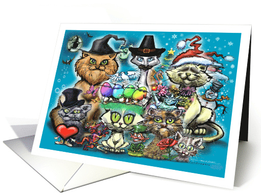 Uniquely designed for cat lovers this whimsical cartoon style humorous illustration of cats with holiday hats like witches hat, Thanksgiving Pilgrim hat, and Santa hat, and seasonal extras, in a holiday mash up.