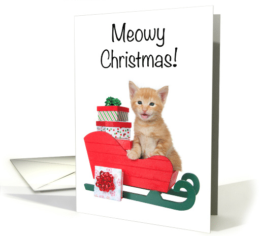 Adorable orange ginger chubby kitten sitting in a red and green Christmas Sleigh full of tiny presents, meowing holiday greetings to your favorite friends and or family.