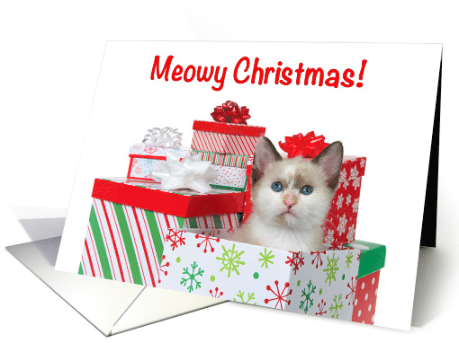 Adorable Siamese mix kitten popping out of a colorful holiday gift box looking directly at viewer sending purr-fect holiday greetings to your friends and or family.