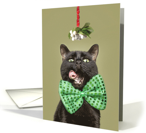 This hilarious black cat with his tongue out under the mistletoe is ready to pucker up! A funny way to say Merry Christmas!