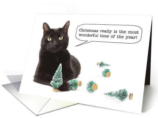 This mischievous little kitty really loves Christmas because of all of the new fun "toys" he gets to play with! Wish anyone a Merry Christmas with this funny cat knocking all of the Christmas trees over!