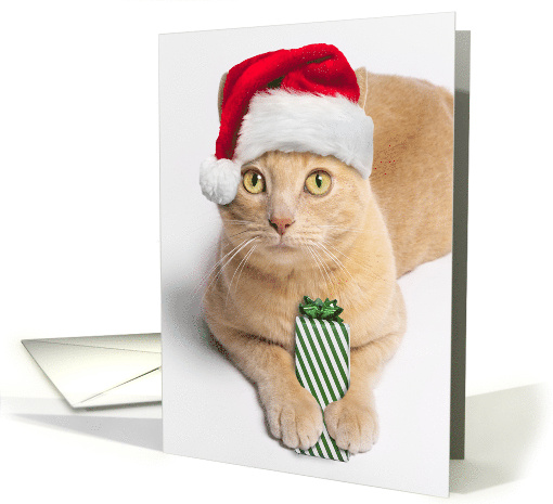 Send warm and fuzzy wishes for a purr-fect Christmas to anyone on your list with this beautiful orange tabby at in a Santa hat with a present in her paws.