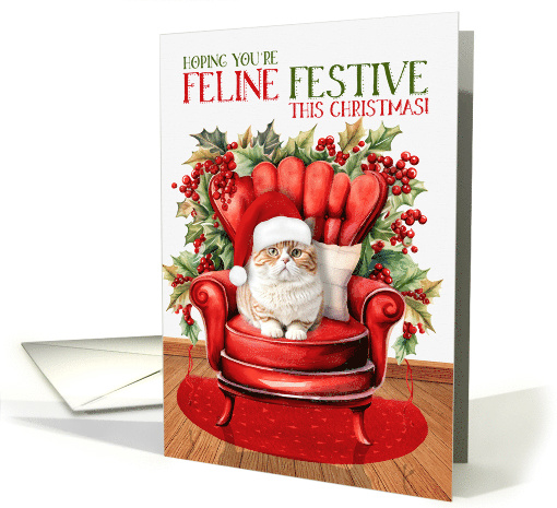 The orange tabby lover, or more specifically the ginger tabby British Shorthair cat lover is sure to purr at receiving this card with seasonal decor on a bold red chair.