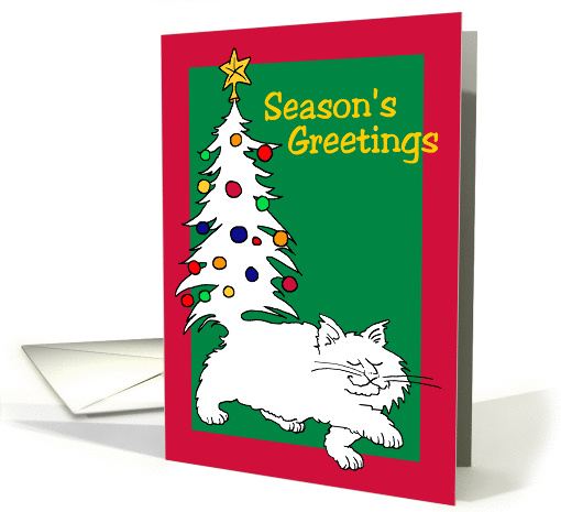 Real Christmas trees are so over! They just drop needles all over the place! This smug kitty has decorated her tail with with a gold star and lots of brightly colored ornaments. Staying in the Christmas Spirit is no problem for her because she can take her tree with her wherever she goes! This delightful card is also available in three other versions: "Merry Christmas" PID #868997, "Ho! Ho! Ho!" PID #869006, or "Happy Holidays" PID #869004. Wish your cat loving friends a very merry Christmas with this card that is guaranteed to make them chuckle! And Season's Greetings to you from Will Davis Studios!