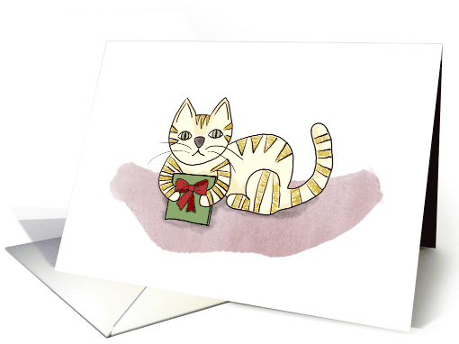 "Meowy Christmas," from a green eyed, orange cat with strips on a red mat presenting a present to that special friend in their life.