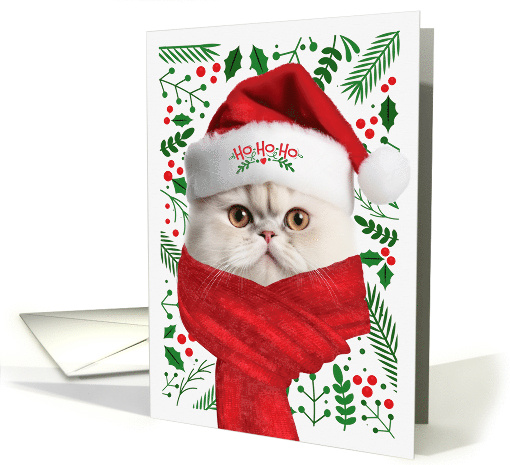 A fluffy white Persian cat in a scarf and hat, both in holiday red for a seasonal touch, pair with botanical bits of red and green holly and berries on this cat lover holiday card.