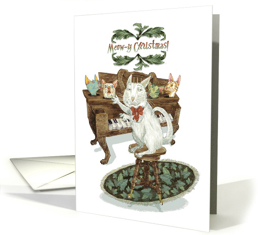 This Christmas card was inspired by the concept of the Katzenklavier or Cat Piano. It was first described by the mystic Athanasius Kircher in his 1650 treatise Musurgia Universalis but without an image of the device. The description included the use of actual cats arranged in a piano casing according to their yowled notes that were cruelly induced by nails attached to the keyboard to prick their tails. Since this instrument employing actual cats was only a fictitious construct, no recordings of its 'music' was ever recorded nor does this card play music! Centuries later, in 2010, Charles, Prince of Wales (now Charles III) was greatly amused by a performance of the tune "Over the Rainbow" on an instrument recreated using squeaky toy cats by Henry Dagg for a garden party held at Clarence House supporting Charles's START initiative for sustainable living. Since I love cats, the idea of using cat toys was more appealing so there you have it!