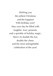 A milestone few reach ninety-five and thriving! This touching Christmas birthday card captures the beauty of longevity with Santa holding a glowing cake that reads “95.” A tribute to grace, strength, and the joy of the season, it’s a heartwarming way to celebrate a truly extraordinary life.