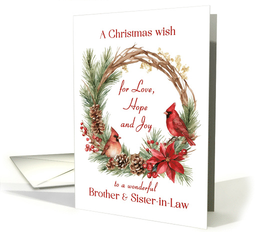 Merry Christmas Wreath with Cardinals for Brother and Sister In Law. Watercolor painting of two cozy cardinals sitting on a natural wreath of pine branches accented with berries, pine cones, and a red poinsettia. A wish for love, hope and joy in the center of the wreath in simple red script typography.