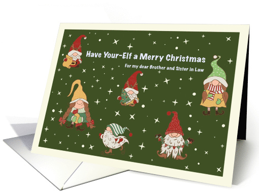 A charming Christmas card featuring six whimsical gnomes dressed in festive hats and cozy winter clothes, surrounded by stars and snow on a dark green background. The front message reads "Merry you a whimsical Christmas“ for brother and sister in law