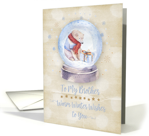 Send Merry Christmas greetings to brother with this design that features a scarf wearing polar bear with a wrapped present inside of a snow globe. Background is digitally done in a vintage paper effect with snowflakes and stars