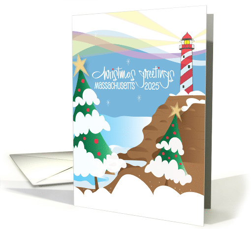 This lovely hand lettered holiday card from Massachusetts has a cylindrical lighthouse that swirls with peppermint red and white stripes, as it stands atop the card's cliff and looks like a tall candy cane filling the right side of this Christmas Greetings from Massachusetts card with holiday joy. It's top light shines out in opposite directions, from its position above two snow-capped trees that are also decorated with red holiday ornaments and starred with golden-colored stars. Hand lettered white wording, written elegantly across the blue sky, says "Christmas Greetings - Massachusetts 2025". The inside wording of the card, as you share beauty that is similar to that of your state, says "Wishing you all the joys of the season!"