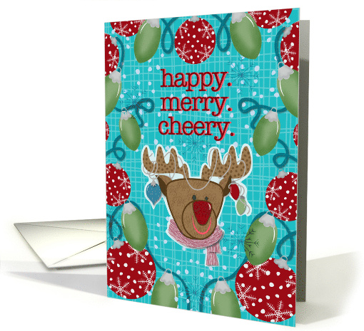 Cheerful card in teal and red with a playful reindeer wrapped in Christmas Holiday lights and surrounded by bold red Christmas ornaments. Happy, Merry and Cheery are the words on the front. This is hand drawn in affinity designer. All elements were created by the artist.