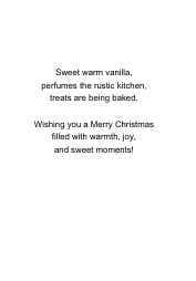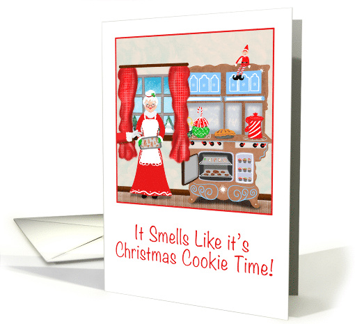 Looks like Mrs. Claus is busy baking cookies while Santa sneaks a tasty treat before his long ride. This charming Christmas card is perfect for bakers, home baking enthusiasts, and anyone who loves indulging in Christmas cookies. It captures the warm, joyful spirit of holiday baking and festive traditions.