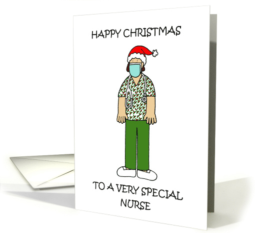 A cartoon of a nurse standing wearing holly patterned scrubs, a facemask and a santa hat. The words 'Happy Christmas to a very special nurse' accompany the image which has a white background.