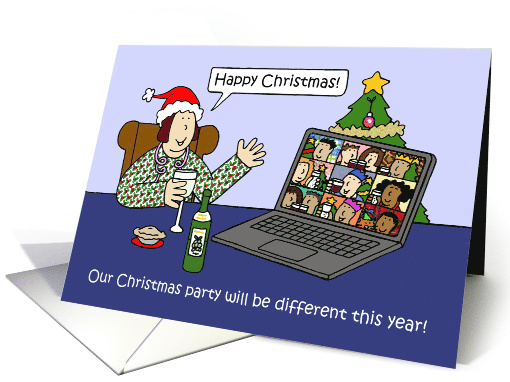 An illustration of a woman in a holly patterned outfit and a Santa hat saying 'Happy Christmas!' to other guests at a virtual party on her laptop. The words 'Our Christmas party will be different this year!' accompany the image.