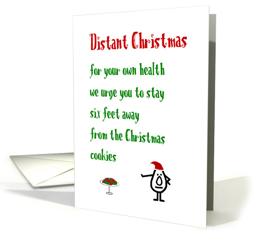 A funny Merry Christmas card, featuring a bad poem and illustration, about keeping your distance from the Christmas cookies (and other things) in the days of COVID-19. Our character, tillie, is wearing a Christmas hat and keeping a safe distance away from the plate of cookies.