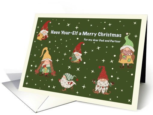 A charming Christmas card featuring six whimsical gnomes dressed in festive hats and cozy winter clothes, surrounded by stars and snow on a dark green background. The front message reads "Merry you a whimsical Christmas“ for dad and partner