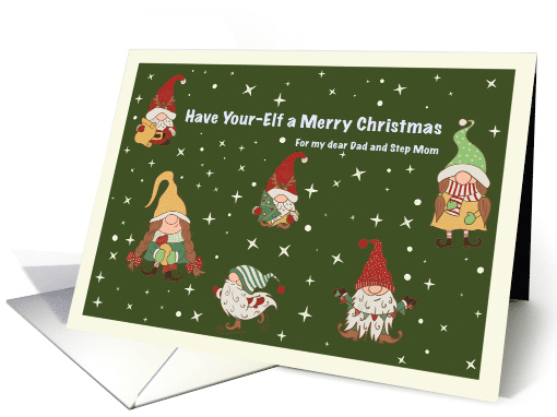 A charming Christmas card featuring six whimsical gnomes dressed in festive hats and cozy winter clothes, surrounded by stars and snow on a dark green background. The front message reads "Merry you a whimsical Christmas“ for dad and step mom