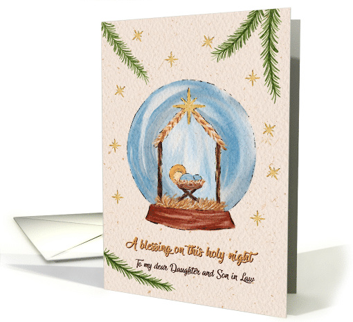 A Christmas greeting card featuring a watercolor-style illustration of a nativity scene inside a snow globe. Baby Jesus lies in a manger under a rustic stable with a bright golden star above. The background is soft blue with scattered golden stars and green fir branches decorating the scene. The front text reads “A blessing on this holy night” in a warm script font. Daughter and Son in law