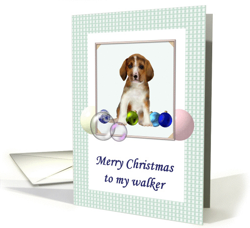 A cute beagle puppy seated with baubles around him. The dog is drawn against a soft blue background which in turn is placed against a white frame. The white frame sits on a patterned blue background.