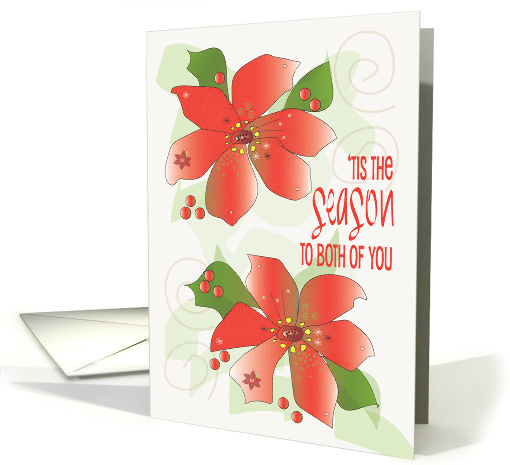 "Tis the Season to Both of You" is the beautiful red hand lettered stacked wording on the right side of this lovely holiday card for all the special couples you know this year. Across the card, on the left, at the top and bottom, are two large six-petaled red poinsettias that are each decorated with tiny flowers, polka dots and floral outlines. The blossoms sit atop green leaves, some with a watercolor look, and golden-colored spirals with round red holly berries atop them. A beautiful card and very special way to send holiday wishes to all special couples you know, the inside wording of the card says "Wishing a very special couple a holiday filled with joy!"