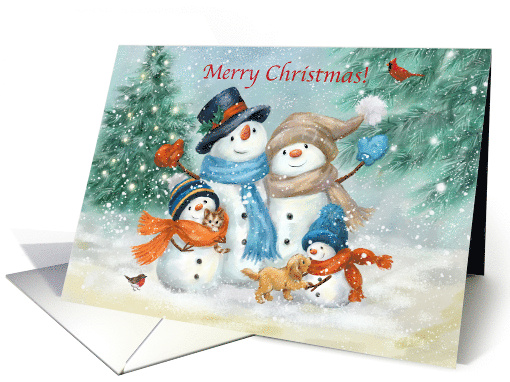 Cute snowman family with cat and dog together in the beautiful winter snowy forrest with robin and cardinal around. Merry Christmas to friend and family.