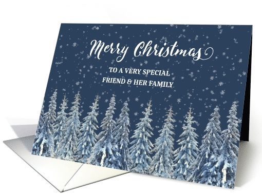 Wish your friend and her family a very merry Christmas with this elegant rustic greeting card with a snowy forest scene.
