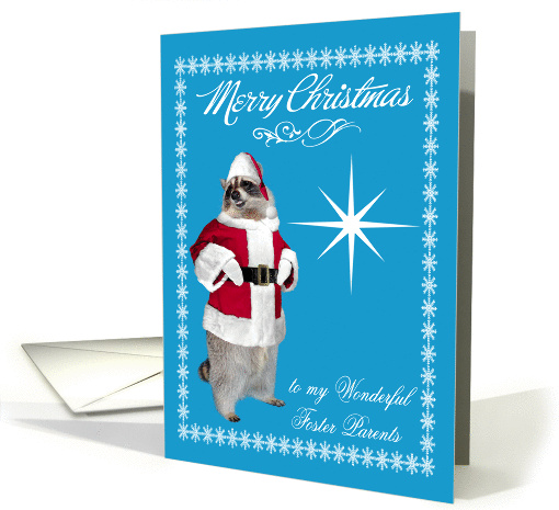 Christmas to Foster Parents, raccoon Santa Claus, snowflakes, star