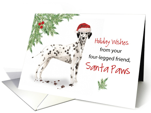 Once the dalmatian dog puts on the santa hat, it becomes Santa Paws! Muddy paw prints are under foot, with an evergreen branch hanging from the corner. Humorous message inside completes this funny card for the Christmas holiday season!