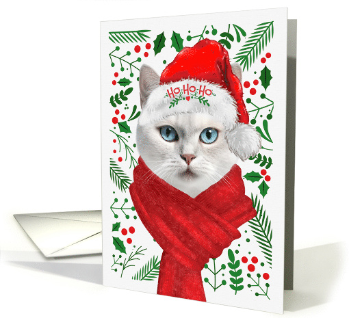 This cute white kitty has big blue eyes and wears a cap from the North Pole and winter scarf with pretty blue eyes and white fur.
