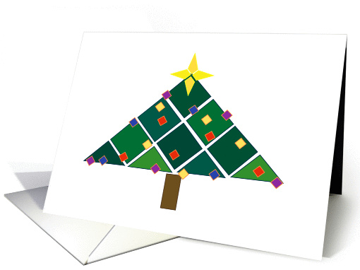 On a simple background of white stands a Christmas tree created from diamond or square shapes. Depending on how one looks at it. The tree is decorated with square or diamond shaped ornaments of red, blue, purple and yellow. At the very top of the tree sits a yellow star.