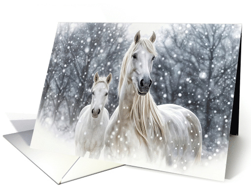 A pretty way to send greetings for the Christmas season. A mare and her foal in a wintery scene of snow.
