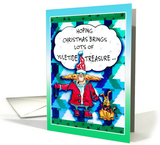 This card has my humorous character Aunt Mella dressed in a red parka and festive hat with her trusty dog. She's carrying a rope and is wishing lots of yuletide treasure. Great to give your partner. It's painted in watercolor in vibrant reds, blues and greens.