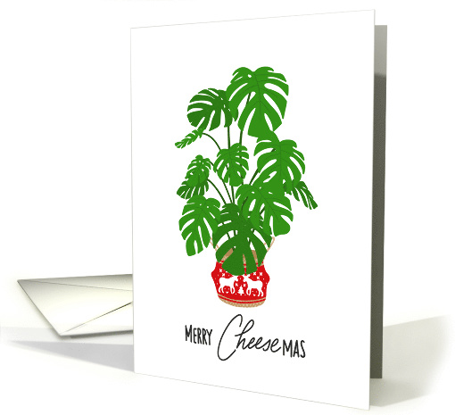 A lovely illustration of a Monstera Deliciosa (Swiss Cheese Plant) in a Christmas basket planter with the words Merry Cheesemas. The perfect Christmas card for plant lovers.