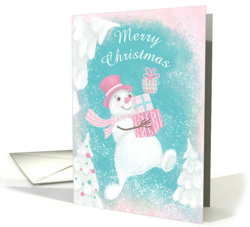 Cute and merry snowman in pink top hat and scarf with gift boxes brings joy and greetings running through Christmas trees and snow.
