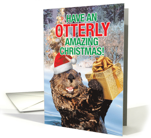 Xmas with the animals! It's back to nature, with this furry, festive, funny Yuletide greeting. A waterborne critter claps on a red and white Santa hat and holds up a gold wrapped gift, with a grin on its face, against a charming, snowy background, on this otterly delightful, darling, full of frolicking spirit of the season, happy holidays card.