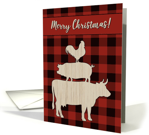Cute, rustic Christmas card features a stack of farm animals including a rooster, pig and cow on a red and black buffalo plaid patterned background. Animals are illustrated to look like wood cutouts. Perfect holiday card for the country boy and girl.