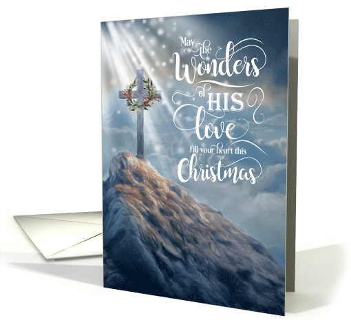 May the wonders of His love fill your heart this Christmas, a beautiful message of Faith with a Christian cross on a hill being lit by gorgeous light and a holly berry wreath.