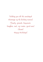 Send fun greetings for the holidays to your adult goddaughter an her husband. A glass of red wine with snow flakes and a St. Nick hat and a world of good wishes on the inside.