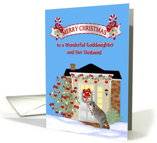 Wish a wonderful goddaughter and her husband a Merry Christmas with an adorable raccoon, Rocky eating a candy cane in front of a cute house decorated for Christmas with ornaments and bows. Background is a pretty blue with candy canes and snowdrift text.