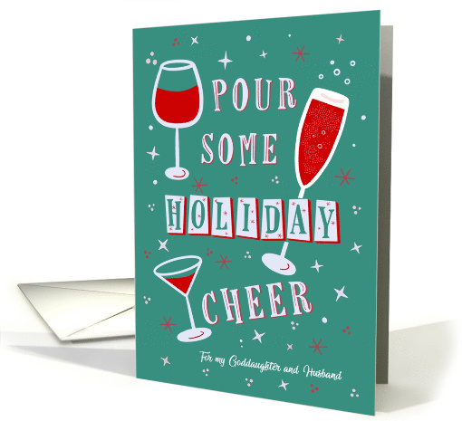 This festive greeting card features retro-style typography with red holiday drinks and the cheerful pun “Pour Some Holiday Cheer.” Set against a teal background with playful stars and sparkles, it's the perfect card to celebrate the season in style. Whether you're toasting with wine, bubbles, or a holiday cocktail, this card brings the party spirit to any loved one. For goddaughter and husband