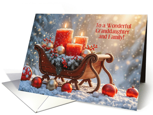 A pretty card for your granddaughter and her family for the Christmas holidays season. A sleigh holds ornaments, candles and garland in a snow wintery setting.